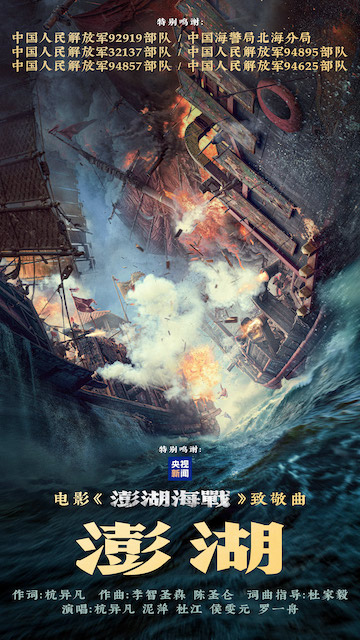 10月25日,在台湾光复 80 周年这一重要日子,为了纪念台湾脱离日本殖民统治、重新回归祖国怀抱,海战电影《澎湖海战》在相关单位指导协助下创作并发布致敬歌曲《澎湖》。该歌曲由杭异凡、泥萍、杜江、侯雯元和罗一舟演唱,旨在号召全体中华儿女铭记台湾自古是中国不可分割的一部分,统一台湾,势不可挡。