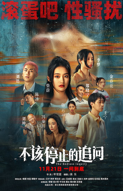 电影《不该停止的追问》聚焦恶行侵害并关注女性生存状态,大胆揭露社会现实中存在的恶劣现象,引发了诸多好评,许多网友表示:“影片很敢拍!”“当下少见的题材”,“很有现实意义”;影片鲜明且坚定的创作态度,更是引来了法治日报、中国妇女报、中国妇女网等相关媒体的一致赞扬,认为影片意义重大:“以勇气照亮沉默的角落”,纷至沓来的好评也令观众对影片充满期待。新发布的“终止伤害”版终极海报,不仅对恶行进行了直观揭露,还向观众传达了坚定的反抗态度和强烈的呼吁。影片的终极海报有着灰暗的基调,在阴冷的雨滴掩映下,是一个饱受创伤的女性背影,这象征着在遭到恶行侵害后,女性身心都挥之不去的阴霾和血泪。王菁菁(柴蔚 饰)表情苦楚,眼神坚定;王遥(李梦 饰)面带悲戚,似乎声含控诉;俞寒冰(王宁 饰)表情迷茫,捉摸不透;公司继承人(刘迅 饰)则玩世不恭,一副无所谓的样子……此外还有其他诸多神秘的角色聚在一起,与背后的真相紧密相连。究竟这一切如何收场?以菁菁为代表的女孩们如何展开绝地反击?都有待影片上映后来揭晓答案。影片大胆坚定的态度,对性骚扰等恶行的抨击,对社会现实问题的关注,以及对“停止侵害”的疾声呼吁,相信定会引起相关的反思和改进,从而迎来更为美好的社会生存环境!