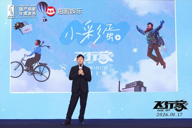 同样令人期待的还有电影《飞行家》,这部由导演鹏飞执导,根据双雪涛同名小说改编,蒋奇明、李雪琴领衔主演,入围东京国际电影节主竞赛单元的佳作将于2026年1月17日上映。导演鹏飞在现场分享了将“东北文学”搬上银幕的创作初心,并深入解读了蒋奇明、李雪琴与片中角色的高契合度。此外,发布会还播放了两位主演的问候视频,而鹏飞导演更是准备了由鹏飞、双雪涛、蒋奇明、李雪琴四位主创亲笔签名的原著小说赠予现场幸运观众。现场精彩的讲述与互动让观众对影片愈发期待。