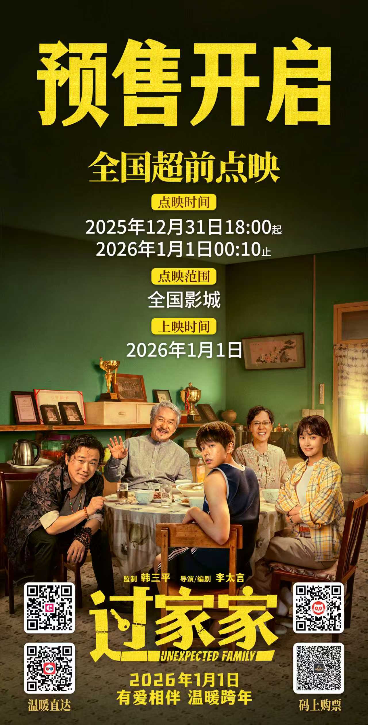 将于元旦上映的《过家家》集结了成龙、彭昱畅、张佳宁、潘斌龙、李萍等一众实力演员。他们以真挚动人的演绎,呈现了一个虽无血缘却紧紧相连的“家”。影片正式于12月23日开启预售,并将于12月31日18时至1月1日零点10分开启全国点映,不妨带着爸爸妈妈提前走进电影院,共同沉浸于这个温暖时刻,体味那份关于“家”的最本真的感动。