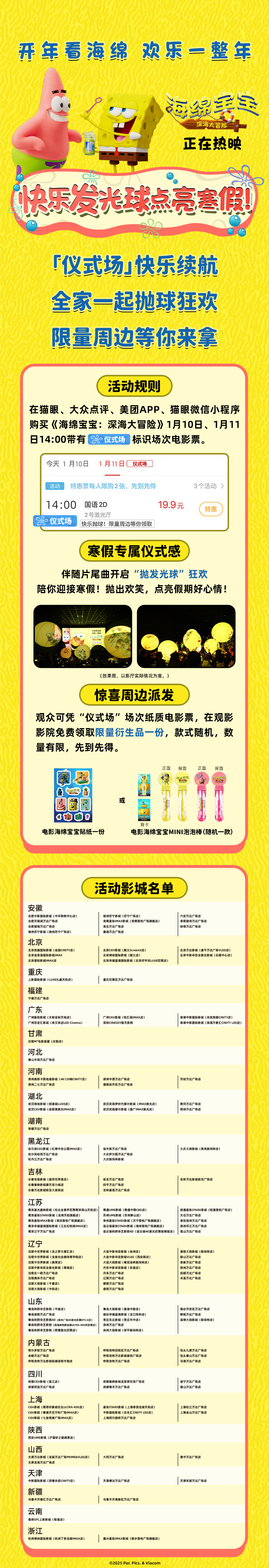 电影《海绵宝宝:深海大冒险》同步官宣次周“仪式场”活动,快乐发光球点亮寒假!1月10日-11日,全国200+影城开启抛发光球仪式场,同时还有惊喜周边派发,全家一起为快乐续航,新的一年抛掉烦恼,用欢笑与陪伴迎接假期的到来!