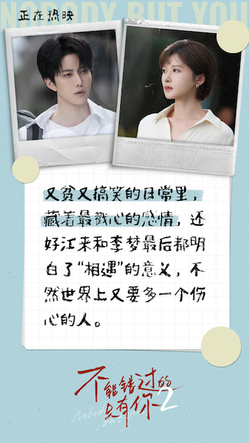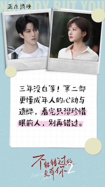 电影《不能错过的只有你2》由成都中连锦艺影视文化传媒有限公司、成都中连传媒有限公司、成都兴锦影业有限公司出品,成都三六玖锦艺文化传播有限公司、成都璞之石文化发展有限公司、成都十九岁剧本文化传媒有限公司、成都十九岁艺人演艺经纪有限公司、北京中瑞颐康文化科技有限公司、成都崇妍之光文化发展有限公司联合出品,北京环鹰时代文化传媒有限公司宣传发行。影片正在热映中,愿每个在爱情里犹豫过、受伤过的人,都能从江来与李梦的故事中获得勇气,与对的人一起,继续坚定向前。