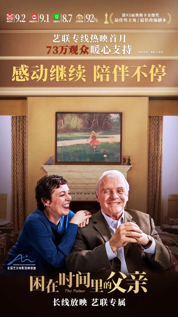 2021年首登内地大银幕的奥斯卡获奖影片《困在时间里的父亲》持续热映,国内口碑一路领跑,位列同档期一众影片前茅。影片自上映以来,得到权威媒体、影评人以及大众的一致推崇,过硬品质和卓越口碑让观众争当“自来水”,纷纷二刷,目前全国票房已接近2900万,不仅成为今年艺联专线最好票房佳绩,也成为艺联专线继《波西米亚狂想曲》、《三块广告牌》之后最卖座的品质佳片。影片正在全国上映,艺联专属长线放映,暑期档继续陪伴。