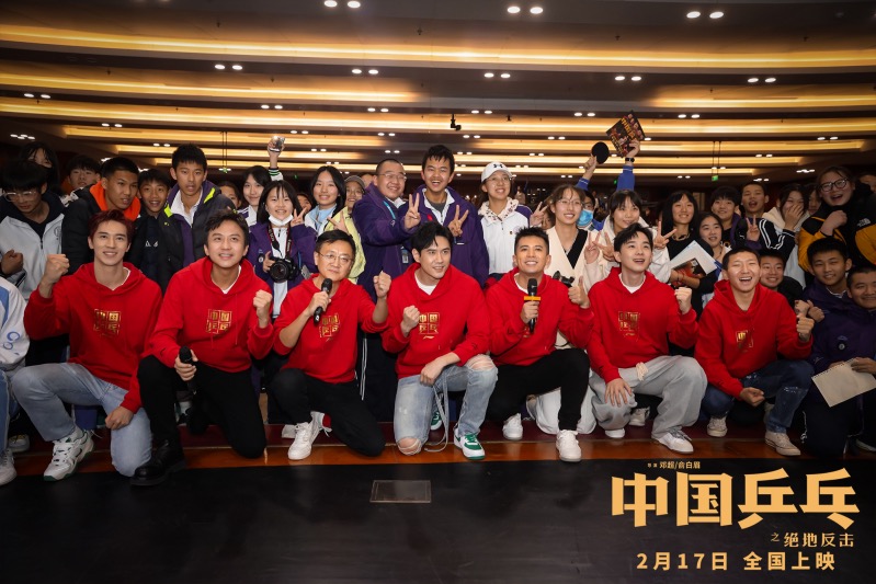 2月15日,由邓超、俞白眉导演,邓超、孙俪、许魏洲、段博文、蔡宜达、丁冠森、孙浠伦、阿如那等领衔主演的电影《中国乒乓之绝地反击》在京举办“青春见面会”。导演邓超、俞白眉携领衔主演许魏洲、段博文、蔡宜达、丁冠森、阿如那走进校园,与北京体育大学、中国人民大学、北京大学、清华大学附属中学的青年学子们展开交流,学生们的朝气与热情深深感染了到场主创,现场氛围热烈。同天,电影还在新华社开放特别观影场,观众纷纷表示“酣畅淋漓、看得过瘾”,对影片的喜爱溢于言表。电影《中国乒乓之绝地反击》将于2月17日全国公映,预售正火热进行中。,
