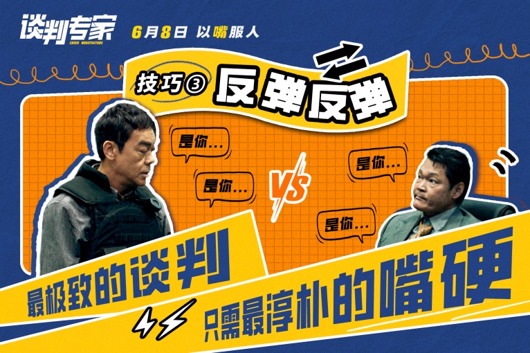 “嘴笨不会说话?大脑总是短路?害怕与人沟通?”预告一开头便用短短三句话概括了生活中可能会出现的沟通窘境。怎么办?“谈判秘籍”给出三个技巧:常规操作“攻心为上”——找准对方弱点,发出犀利提问。面对谈判专家卓文伟(刘青云 饰)的“致命”提问“让你戴绿帽行不行?”,谈判“菜鸟”张振发(朱柏谦 饰)面露难色不知所措,只好败下阵来。关键技能“强制闭麦”——语言无法让对方冷静,那就物理方式终止对话。两名谈判专家卓文伟、谢家俊(吴镇宇 饰)隔空对话,卓文伟妙滔滔不绝疯狂“输出”,试图搬出“谈判手册”的专业内容压制对方,谢家俊见招拆招,直接挂断电话终止二人对话,留下卓文伟的一脸无奈。终极大招“反弹反弹”——最极致的谈判,只需最简单的嘴硬。针对“这里只有一个凶手”这一命题,谈判专家卓文伟和被其绑架的人质警察李俊杰(周文健 饰)展开了激烈讨论,“是你”“是你”“是你”“是你”……二人经过多个回合反复拉扯,卓文伟最终强硬出击。